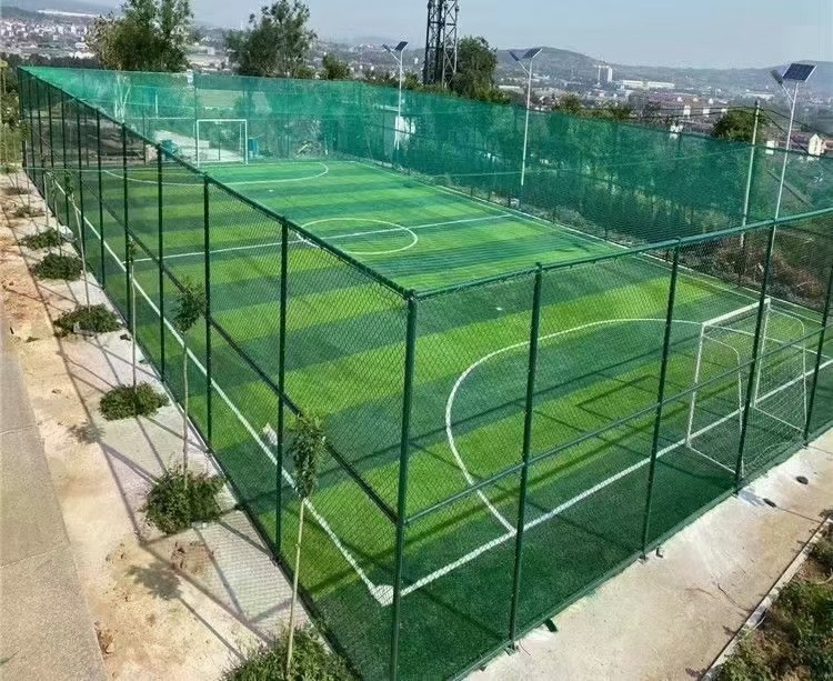 足球場圍網(wǎng)金屬絲包塑編制,在平米緊繃的情況下還能有一定的彈性,有利避免人員碰撞傷害,減足球碰撞后的反彈力度。